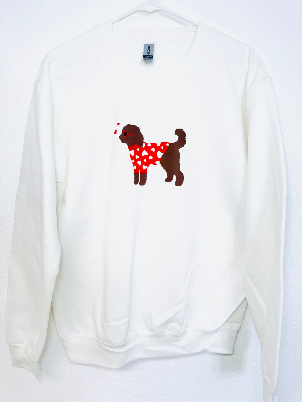 Show your love for both Labradoodles and Valentine's Day with our Doodle Valentine's Day sweatshirt! Featuring a cute Brown Labradoodle in a festive sweater and heart-eye sunglasses, this sweatshirt is the perfect gift for all Doodle dog moms. Stay stylish and cozy with this sweatshirt!