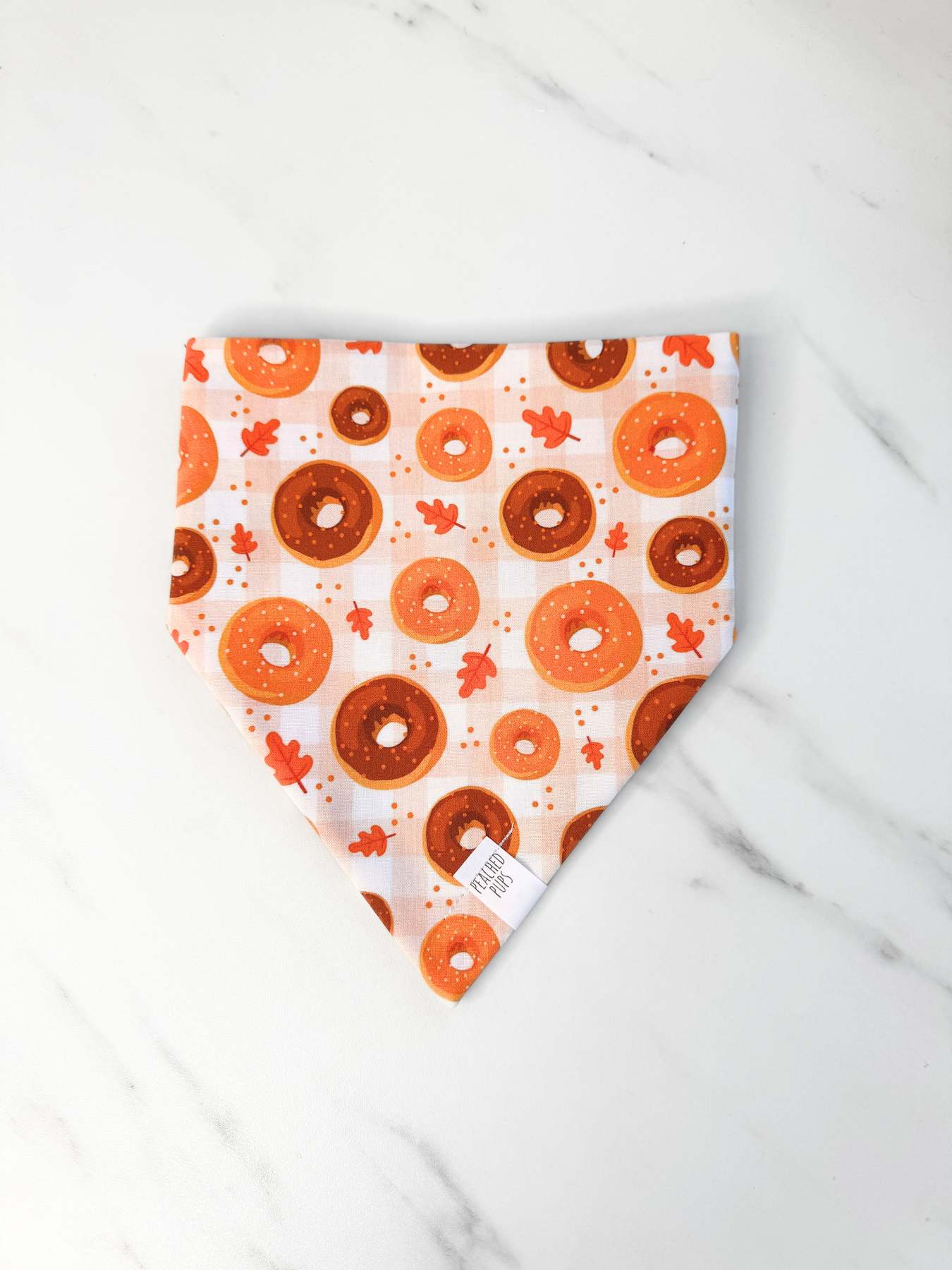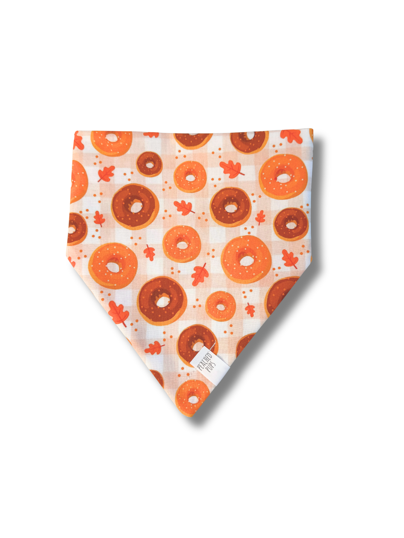 Fall isn’t complete without apple cider donuts — and now your dog can wear them. The Cider Season bandana features warm cinnamon donuts, scattered Fall leaves, and a soft gingham-style background for that perfect cozy-bakery Autumn aesthetic.