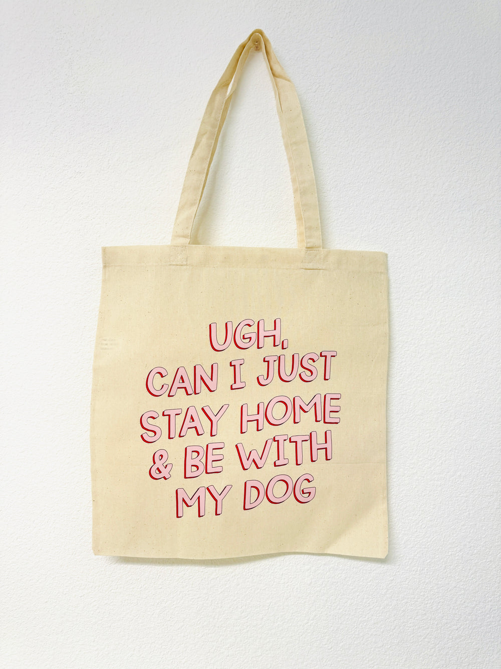 But what truly makes this tote bag a standout is its witty and relatable message: "Ugh, Can I Just Stay Home & Be With My Dog." With its humorous typography and understated design, this tote captures the sentiment of every dog owner who's ever longed for the simple pleasure of cuddling up with their canine companion.