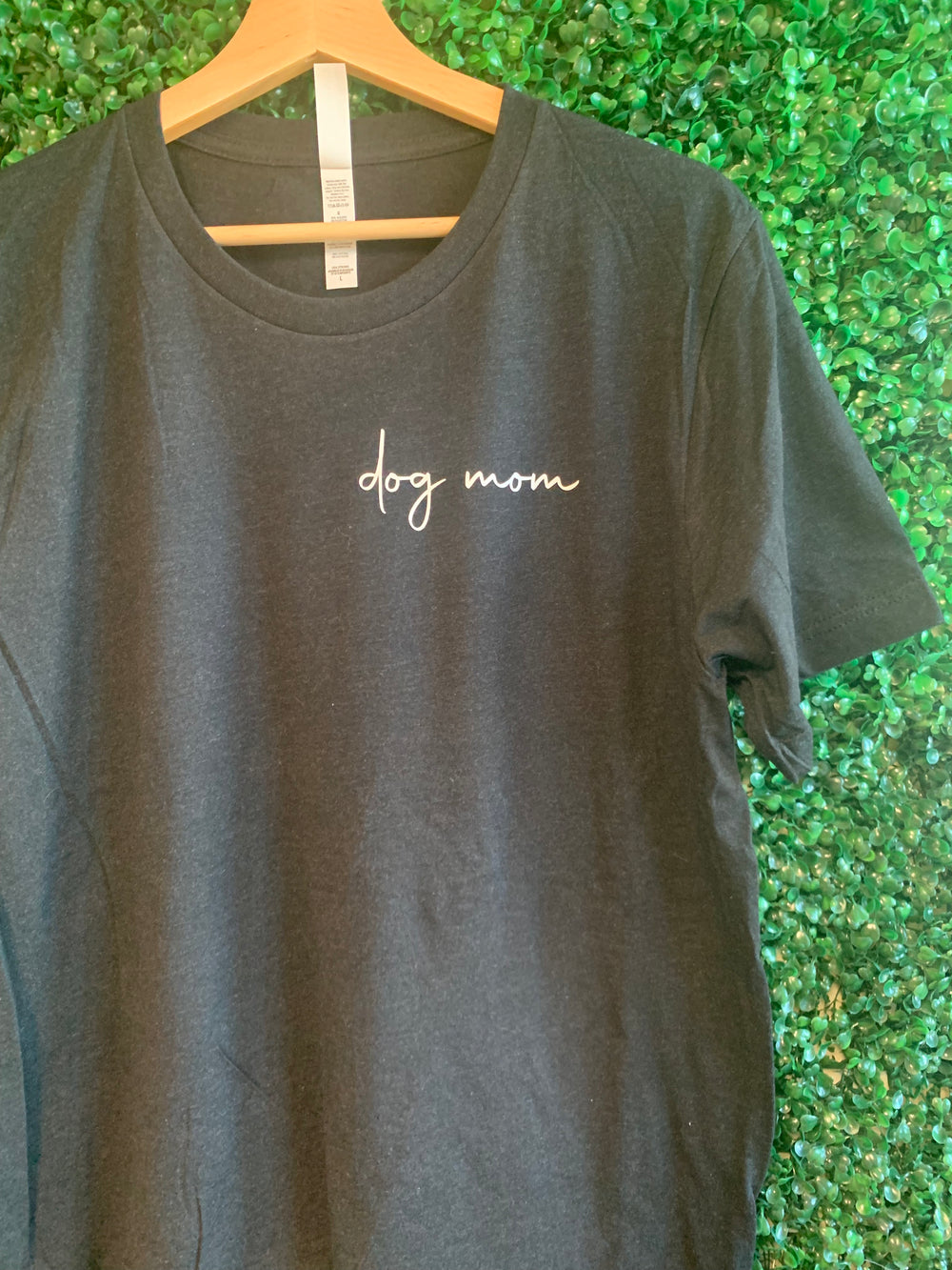 Elevate your dog mom style with our "Dog Mom" Cursive Corner Shirt, where understated elegance meets your love for your furry friend.
