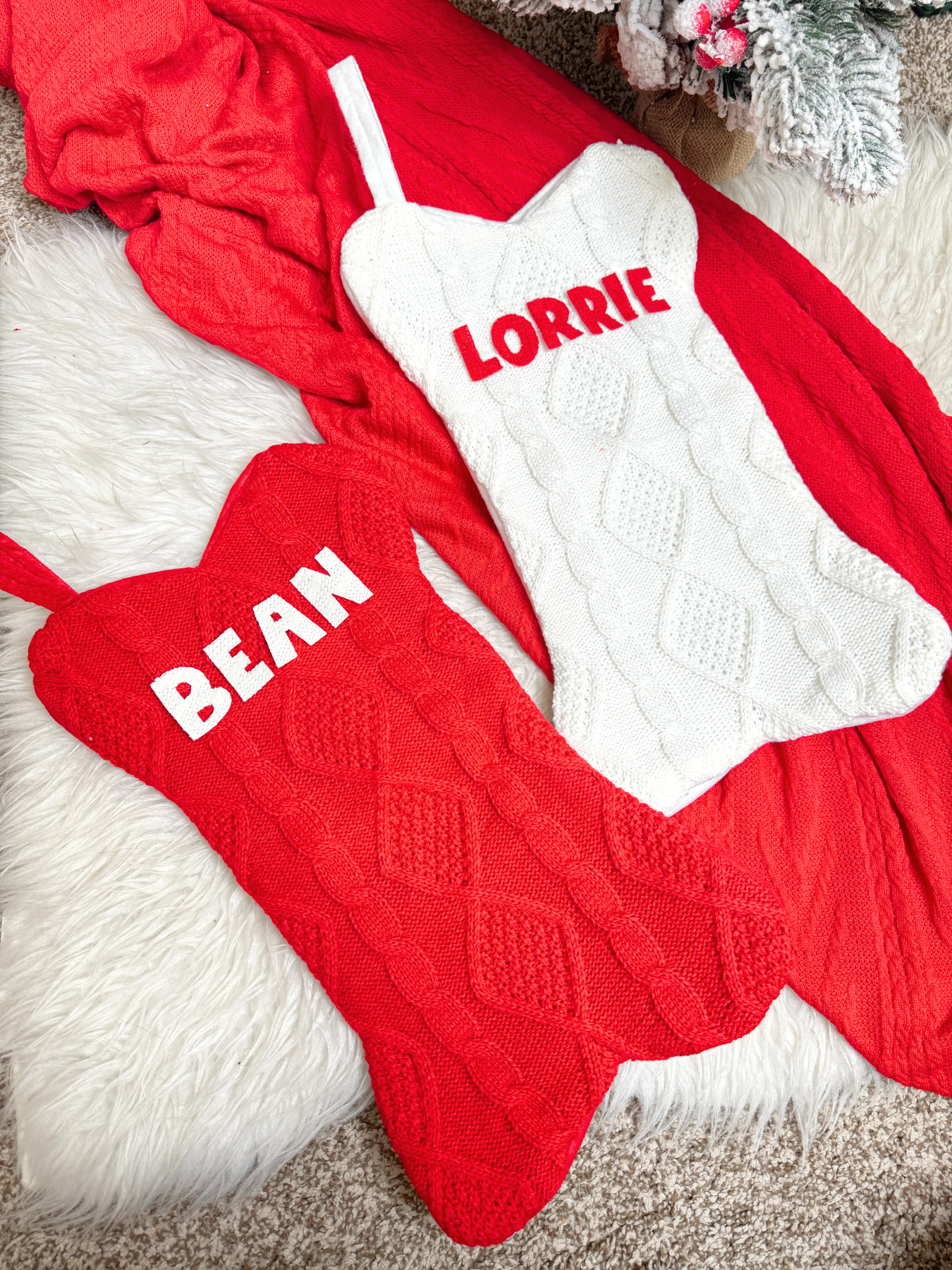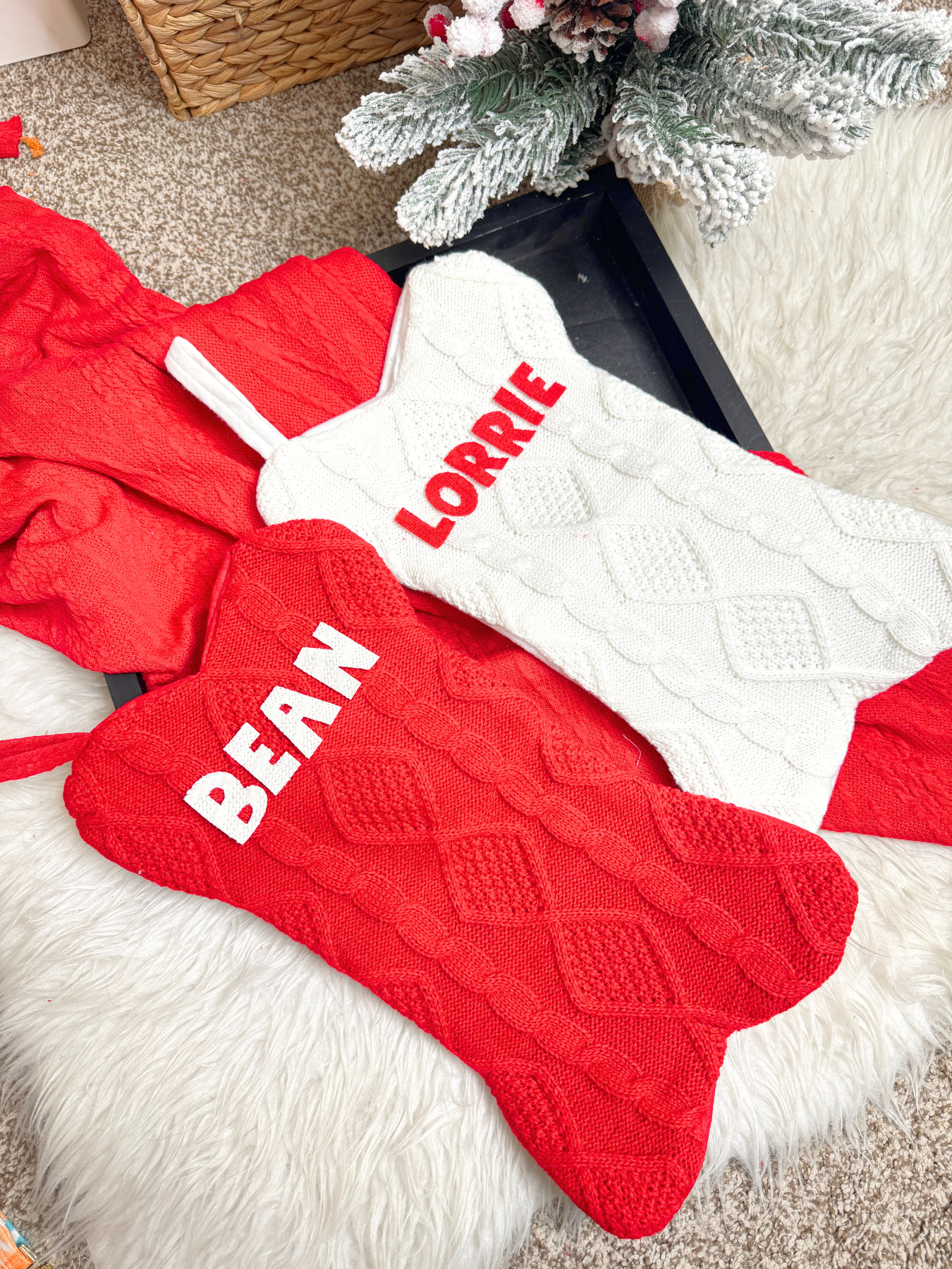 Custom Dog Bone Christmas Stocking – Knit Pet Stocking in Red or Cream